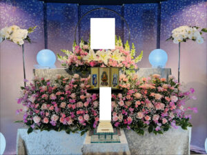 ピンクのバラをメインとした華やかな祭壇を選ばれました。